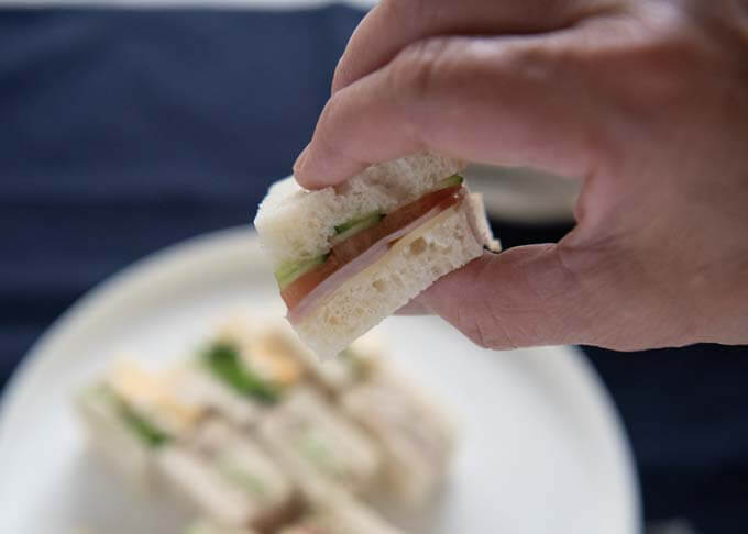 Zoomed-in photo of a piece of ham sandwich picked up with fingers.
